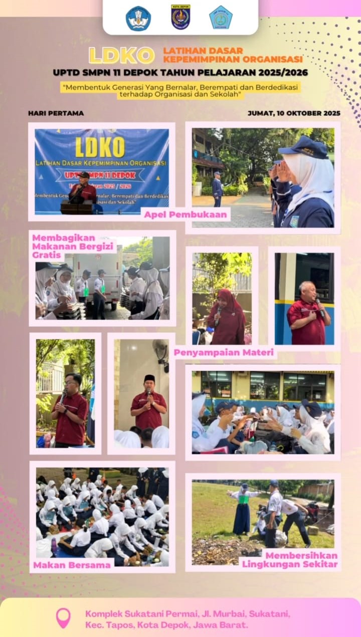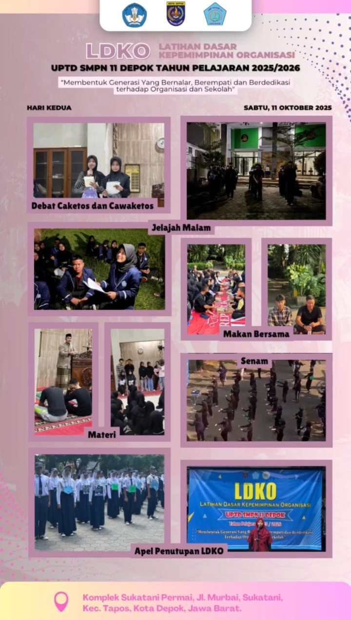 Pada tanggal 10–11 Oktober 2025, telah sukses diselenggarakan kegiatan Latihan Dasar Kepemimpinan Organisasi (LDKO) yang menjadi agenda rutin dalam rangka membekali anggota baru dengan dasar-dasar kepemimpinan, organisasi, dan pengembangan karakter. Bertempat di UPTD SMP Negeri 11 Depok, kegiatan ini diikuti oleh para peserta dengan antusiasme tinggi. Selama dua hari pelaksanaan, peserta mendapatkan berbagai materi penting seputar :